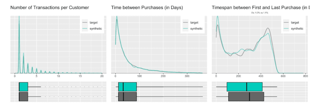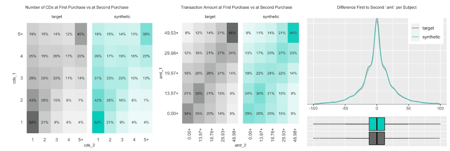 These first plotted distributions already show the high degree of agreement between the original (labeled as target) and the synthetic dataset. Not only in terms of their mean and variance, but also across the whole distribution, together with its deciles, skewness, and multiple modes. Further, the relationship between multiple variables is retained near perfectly as well. This can be seen from the righter most chart, that reports on the ratio between the number of CDs and transaction amount (i.e. on the average price per purchased CD).