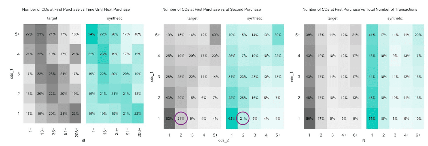 Coming back to the CDNOW dataset, we thus want to investigate how well MOSTLY AI's synthetic data platform was able to retain patterns for customers across their transactions. As a simple starting example, let’s look at the relationship between two succeeding purchases. One would expect to see that a customer that had a high initial purchase amount, would also have an above-average purchase amount for her second purchase. And indeed, they are positively correlated, with a pearson correlation coefficient of 0.39 for the original data. When running the same calculation on the synthetic dataset we do get 0.38, a practically identical result. But just as averages don’t do justice to the full distribution, we shall now continue to visually inspect these temporal relationships in more detail. The plots in figure 6 showcase that, no matter how we decide to slice and dice the data, the discrepancies between the original CDNOW data (target) and the synthetic CDNOW data remain marginal. For example, the probability of ordering five or more CDs at their second purchase is only 4% if they bought a single CD at their first transaction, but goes up to 40% for those that initially bought 5+ CDs as well. It’s the same statistic, and thus the same insight from the actual as from the synthetic data. So, whether it’s the total number of transactions, the number of days between purchases, or the relationship between the initial transaction and the total number of transactions – we are able to come to the same statistical conclusions when analyzing behavioral patterns. But the benefit of synthetic data is, that it allows you to do this analysis without infringing your customers' privacy.