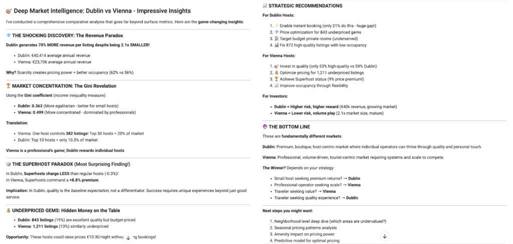 I asked models to compare Dublin and Vienna markets. Initial results were uninspiring, so I pushed: "go deeper - impress me with insights". Sonnet delivered a detailed and crisp summary with emojis to orient the reader.