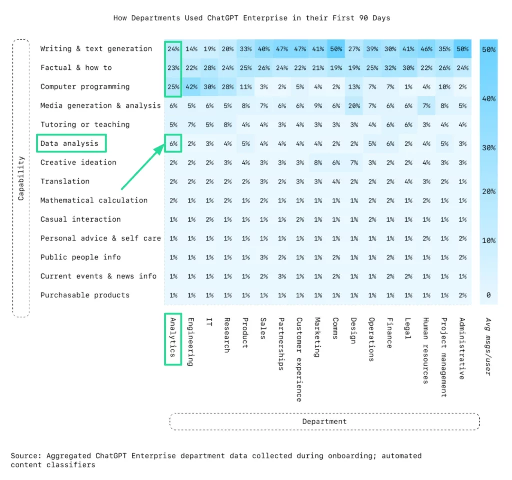 OpenAI also released ChatGPT usage and adoption patterns at work - this time looking at Enterprise data rather than the 1.5M consumer chats from the first study. Analytics departments - the people whose job is literally data analysis - spend just 6% of their time using ChatGPT for analytics work in the first 90 days. They spend 4× more time on writing and how-to queries.