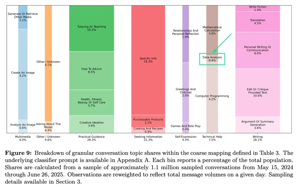 Greg Isenberg's viral take last week on OpenAI's report about How people are using ChatGPT. I read all 61 pages of the report the old fashioned way, sans LLM. As a startup focused on data intelligence, I admittedly gulped when I saw only 0.4% of use cases relate to data analysis. The counter-narrative becomes quite compelling: focus on what people are NOT using ChatGPT for, rather than going head-to-head. But that's too simplistic. There are two reasons data analysis sits at 0.4% instead of 10%: environment mismatch and data access constraints.